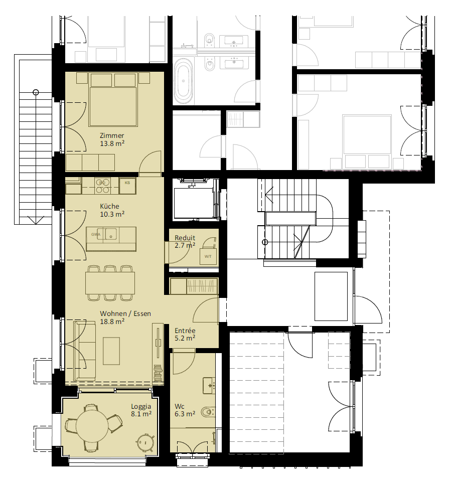 | 2.1.1 | 4.5 | 1.OG | südwest | 107.3 m2 | CHF 635'000 | |||