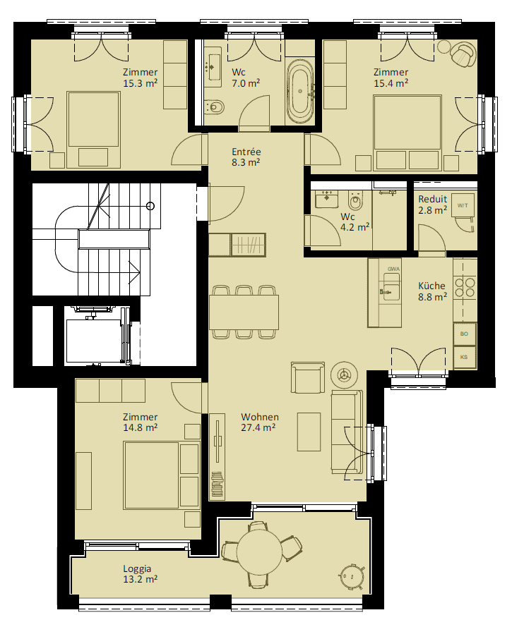 | 1.0.1 | 4.5 | EG | südwest | 109.2 m2 | CHF 650'000 | |||